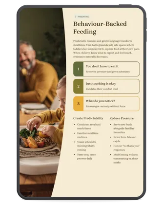Feeding Psychology Deep-Dive: Understand how toddler brains and bodies work around food — and how growth, development, and gut health affect eating behaviour. Get the scripts, routines, and behaviour-backed strategies to reduce power struggles and lead mealtimes with calm.