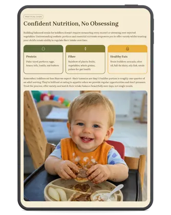 Visual Meal & Snack Tools: Balance meal ideas your toddler eats in seconds — no nutrition degree needed. Get instant access to balanced meal templates, portion visuals, and the full Recipe Vault — packed with ideas high in iron, fibre, and protein — so you always know what and how much to serve.