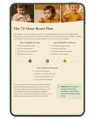 The Gut-Friendly Recipe Vault: 66 Done-for-you recipes designed for toddler taste buds, digestive health, and parental sanity — with no over complicated ingredients or hours in the kitchen.