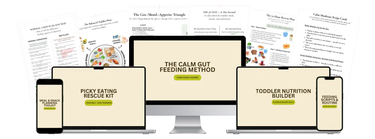 The Calm Gut Feeding Method gives you a complete, evidence-backed approach to toddler nutrition, gut health, and behavior — plus 7+ bonuses that fill the everyday gaps most parents struggle with. From meal planning to sick days, so you’re never left guessing.